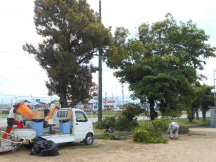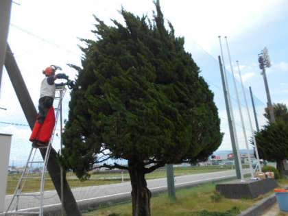 グラウンドの樹木の剪定作業をしました。近隣の学校の用務員の方々に応援いただき、みるみるすっきりとした姿に変わっていきました。