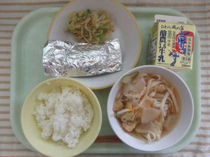 今日の献立は、ごはん、かしわうどん、さばの銀紙焼き、甘酢あえ、牛乳です。