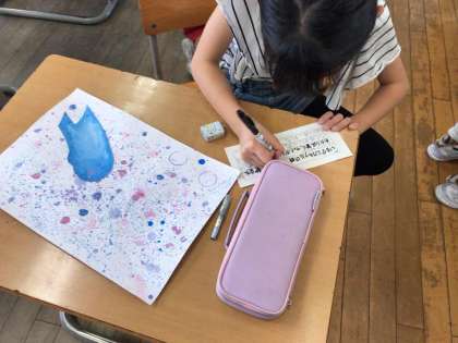 材料を使ってできた模様を生かして作品をつくました。工夫した点を作品カードに書き、掲示しました。
