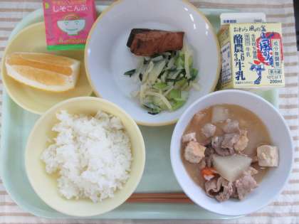 きょうの献立は、ごはん、ふくらぎの照り焼き、ジャガイモの千切り炒め、かぶと厚揚げの中華煮込み、河内晩柑、牛乳、しそ昆布ふりかけです。