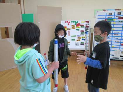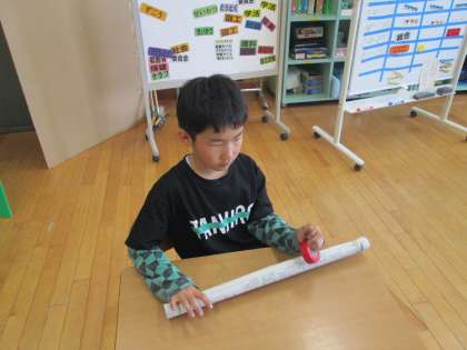 1、2枚目は、自立活動「体を上手に使うトレーニング」の様子です。新聞紙を丸めて、ビニールテープを巻くと簡単にトレーニング棒が出来上がります。物をコントロールする力が身に付きます。