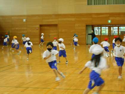 楽しい鬼ごっこ遊びを学習しています。学習の前には、しっかりと準備体操をしています。各クラスの体育係が、手本となって体操ができました。