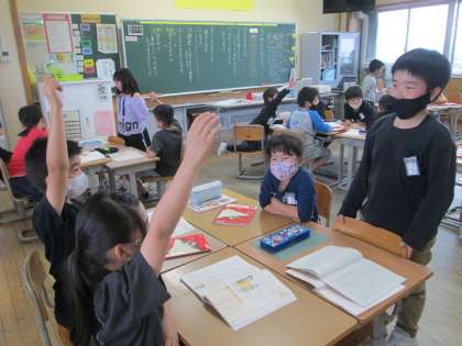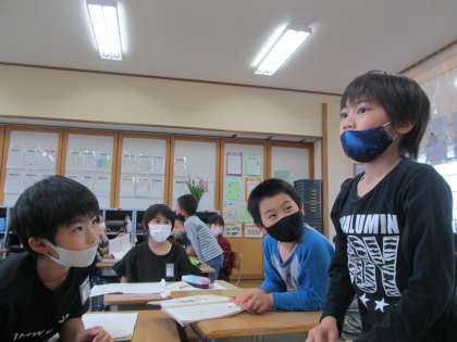 国語科「もっと知りたい、友だちのこと」で、友達の話を聞いて質問する学習をしています。友達の休みの日にしていることや習い事の話を聞いて、「いつ、どうして、どのように」などの詳しい話を聞くための質問がたくさん出ていました。