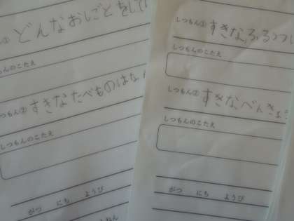 生活科「がっこうたんけんにいこう」の学習で、学校の先生や職員に質問(インタビュー)したいことを考えました。インタビューはどきどきするけれど、「たくさんの先生と早く仲良くなりたいな」と思っている1年生です。