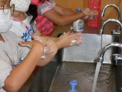 いつも給食前に「おねがい、おねがい、かめさん〜・・・・」という手洗いの曲が流れています。手の洗い方は、洗面所の鏡の前に貼ってありますが、もう一度、洗い方の確認をしました。みんな上手に手洗いできていました。