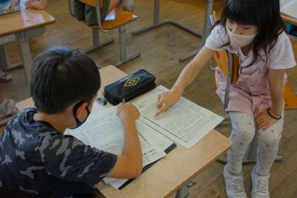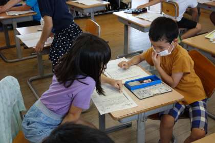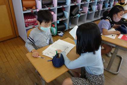 説明文の学習を行っています。子供たちは、2年生の学習経験を生かし、文章の組み立てを捉えようとしていました。写真は、ペア見つけた「問い」と「答え」を確かめ合っているところです。