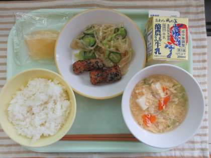 今日の献立は、ごはん、ちくわの南部揚げ、はるさめサラダ、かきたま汁、冷凍リンゴ、牛乳です。