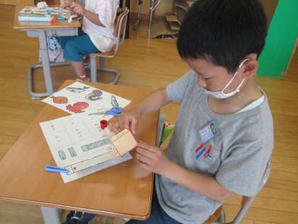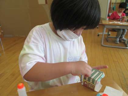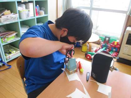 ペーパークラフトの様子です。指先を細かく動かし、丁寧に作品を作っています。今後、作ったものを使って、お金の使い方や人とのかかわり方を学習するおみせやさんを開きます。