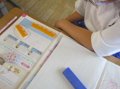 算数では、たしざんの学習を進めています。今日は「ふえる」もたしざんになることを学習しました。ブロックを使って考えたり、たしざんの式や答えをノートに書いたりしました。