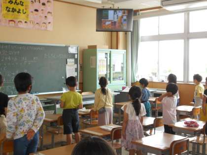 給食後、全校で今月の歌「すてきなともだち」の歌の指導がテレビで行われました。上手に歌うポイントは3つです。