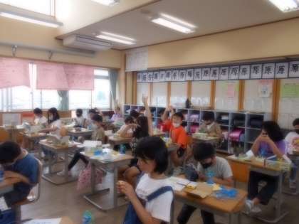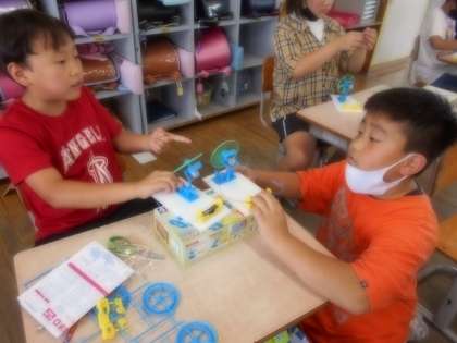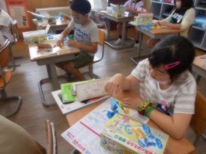 「電池の向きによって、電流の流れ方はちがうのだろうか?」という課題解決のために、正しく回路を作り、プロペラの回り方の実験を行いました。一人一人が実験キットを使って実験を行うことで、実感を伴う理解ができます。近くの友達と、気付いたことを伝え合うなど、たくさんの発見ができた子供たちでした。