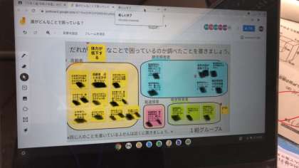 総合的な学習の時間です。今日は、「誰が」「どんなことに」困っているのかを今までの経験から思い出したり、調べたりして紹介し合いました。そして、誰の幸せについて考えるのか課題を決めました。