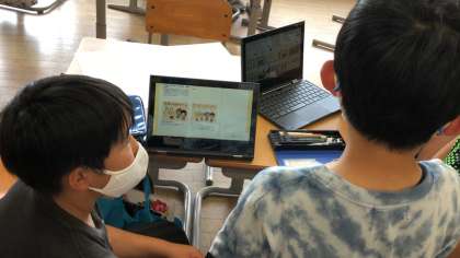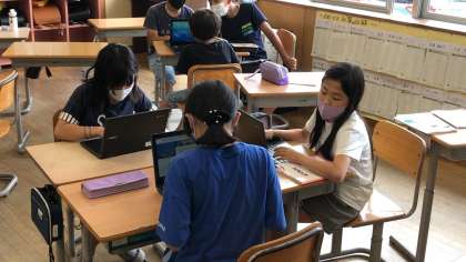 やっていることはバラバラでも、向かう先は、学級目標達成。係活動に取り組んでるみなさんです。ここでもタブレット端末の利用が始まりました。どんどん学び方がアップデートされています。