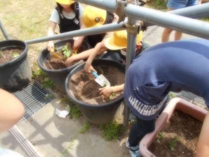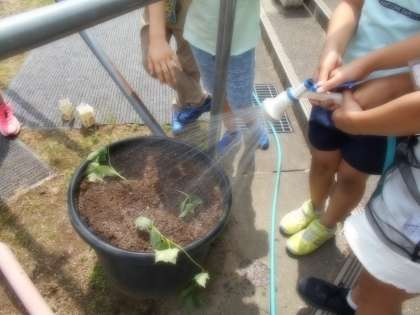 本葉が3〜4枚になったので、大きなプランターに植え替えをしました。子供たちは、元気に育ってくれるように、水やり当番の確認等を行いました。これからのへチマの生長が楽しみです。