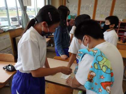 誰が誰に書いているのかは渡すまでのお楽しみ…。もらった後は、うれしそうな表情をする子供たちでした。