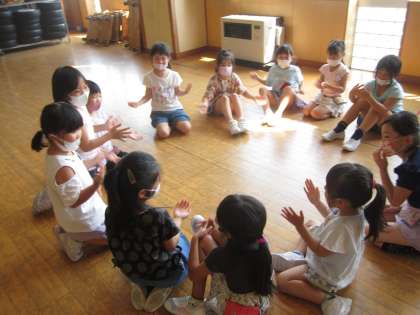 「たんたんたんうん」のはくに合わせて、ことばあそびをしました。「りんご」「ばなな」「めろん」など、はくに合った言葉をつないで楽しみました。