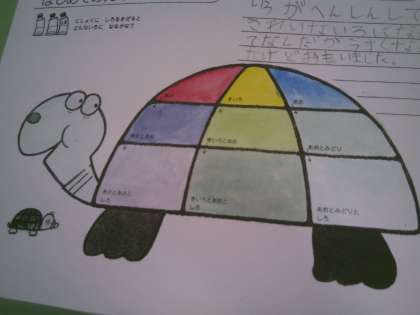 水彩絵の具で色を塗りました。亀の甲羅はすてきになったかな?