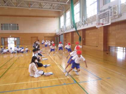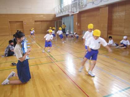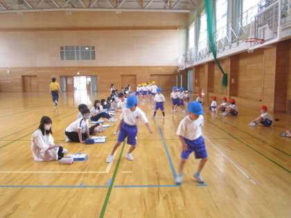 1組は、反復横跳びの本番をしました。6年生に数を数えてもらいました。ワークスペースなどで練習をしてきたので、本番では、上手に、早く跳んでいました。