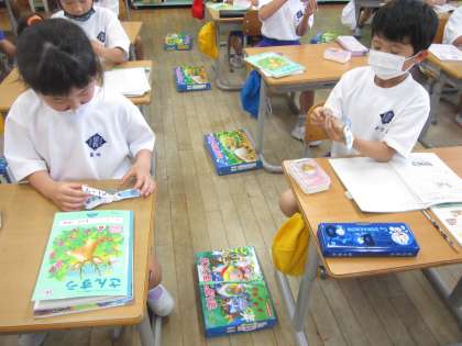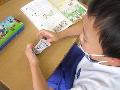 算数のたしざんの学習では、たしざんカードを使って計算練習をしていきます。今日は計算カードの使い方の練習をしました。早く、正確に計算できるように、こつこつと練習していきたいと思います。