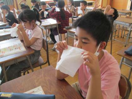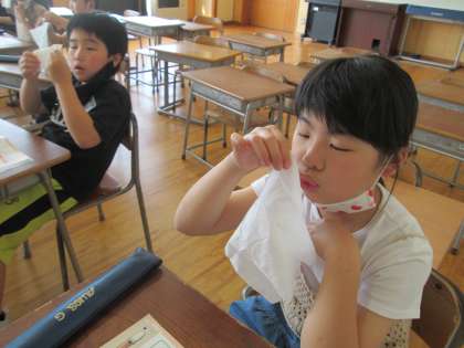 リコーダーを吹くときの息の出し方を確認しました。ティッシュを使って息が出ているか確認中です。