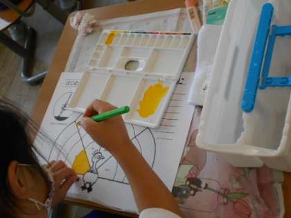 水彩絵の具と絵画筆を使って、丁寧に色を塗り分けていきます。