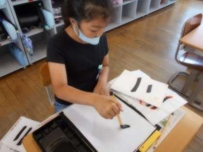 先週学習した横画の筆遣いに気を付けて、「二」の練習を行いました。「トン、スー、トン」のリズムを守り、穂先の向きに気を付けて書きました。筆遣いが、だんだんうまくなってきている子供たちです。