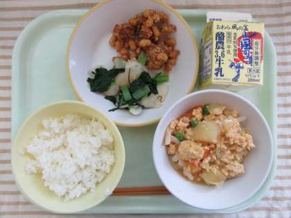 今日の献立は、ごはん、大豆とホタテのごまからめ、昆布和え、卵とじ、牛乳です。