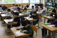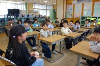 机の上に水彩バケツやパレットを置いて、筆を使って絵の具の塗り方を学習しました。水を少しずつ足していくと、だんだんと色が薄まっていくことを実感していました。
