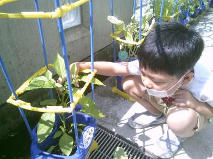 野菜のお世話について調べたことをさっそく実践です。脇芽をとったり、今の野菜の様子を写真に撮ったりしました。愛情いっぱいで育てている子供たちです。