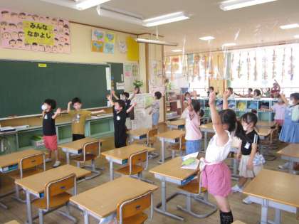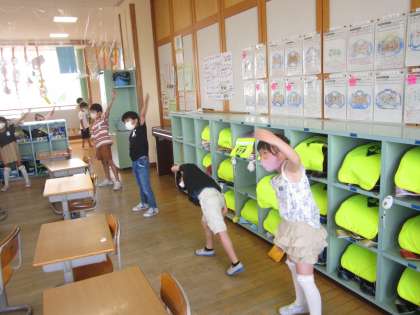 今日のわくわくトレーニングは、ラジオ体操です。指先まで伸ばしたり、体を大きく動かしたりするなど、5月のときよりも上手になってきました。