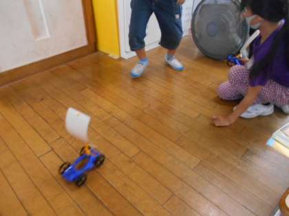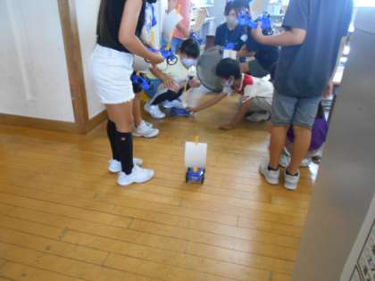 風は目には見えなせん。道具を使って、可視化していきます。作った車をさっそく扇風機による風を受けて走らせています。