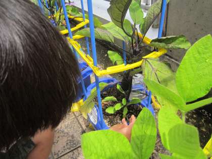野菜の実がなってきて嬉しそうな子供たちです。野菜がおいしくし育つように今日は追肥をしました。