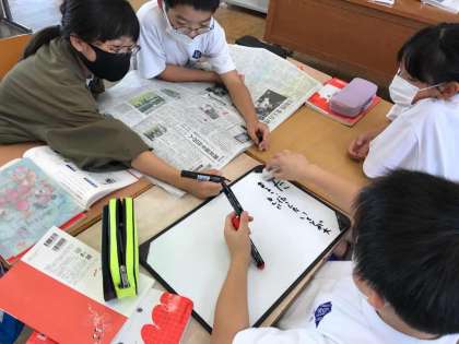実際に新聞を見て工夫を見つけました。記事の大きさや写真の配置など沢山の工夫に驚きとともに感心していました。