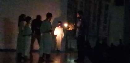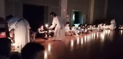 雨になったため、キャンプファイアをキャンドルサービスに変更して行いました。火の神から「Try アンド go」「ワンチーム」「輝き」の火を頂いた火の守たちが、燭台に点火、仲間に分火を行いました。火を見つめながら、今日1日を振り返る子供たちでした。