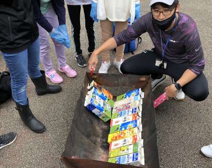紙パックの中には具材を挟みアルミホイルでくるんだコッペパンが入っています。さあおいしく焼けるかな。