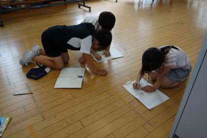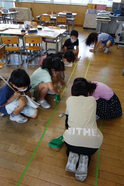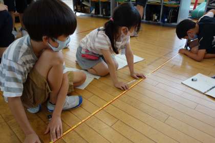 今日は、まきじゃくを使って、1mものさしでは測ることのできない長さを測りました。