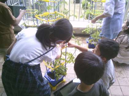 「枯れた葉っぱはとった方がいいよ」「鉢の下に水が落ちるまでたっぷり水やりをするといいよ」などと、野菜が元気になるためにどうしたらいいか、調べたことを伝え合いました。その後、友達と相談したり教え合ったりしながら、野菜のお世話をしました。