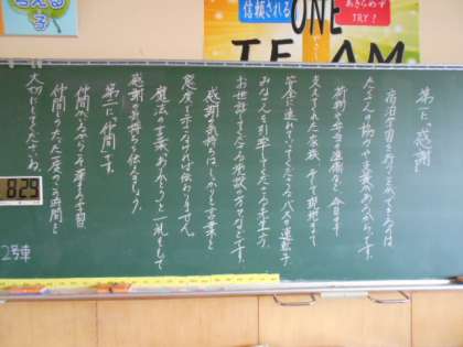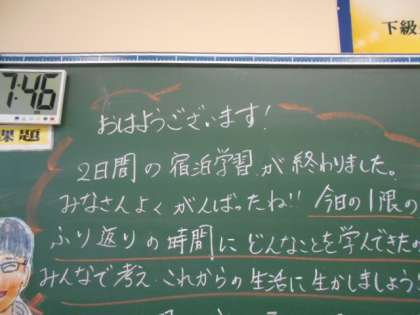 5年生と6年生の教室の黒板には、朝、担任からのメッセージが書かれていました。1泊2日で出かけた集団宿泊学習の意味や学びの確認が書かれています。今日は、たくさんの活動から学んだことを具体的にと振り返る予定のようです。