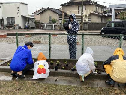 子供が2人、カッパを着て参加してくれました。小さな手で、どろんこになりながら、上手に花の苗を植え替えてくれました。周りがほんわかと温かい雰囲気につつまれました。