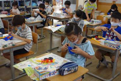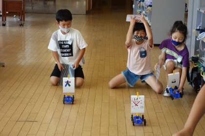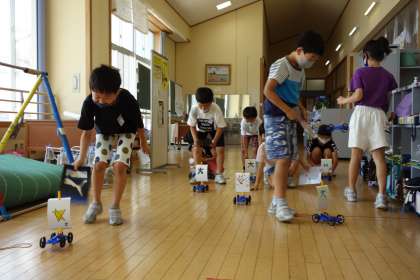 風の力で動く車を作り、実際に動かしてみました。どのようにしたら遠くまで動くのか、試しながら車を動かしていました。