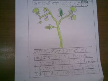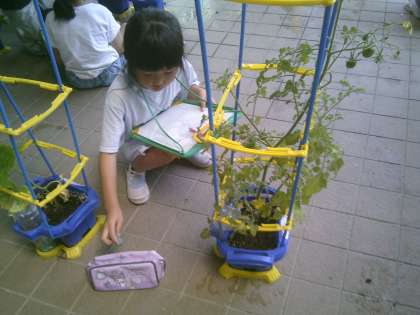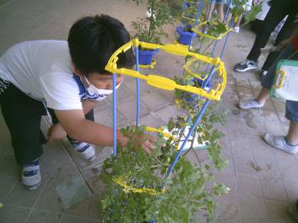 自分の育てている野菜をよく見て観察しました。さっそく算数で学習した竹ものさしを使って、自分の野菜の葉や実の大きさを測っていました。もうすぐ、収穫できそうで、わくわくしている子供たちです。