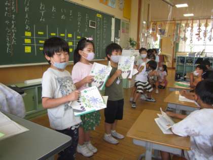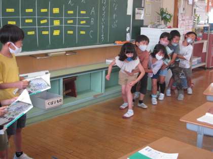 おおきなかぶの音読発表会をしました。登場人物の気持ちになって読んだり、動きを付けたりしながら、グループに分かれて音得劇をしました。力強く「うんとこしょ、どっこいしょ」と言ったり、かぶが抜けたときの驚きや喜びを動きで表現したりするなど、今までの学習を生かして発表することができました。