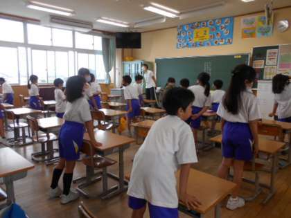 朝の会では全校一斉に歌を歌います。今月の歌は「虹」です。担任も一緒に歌い、校舎中に大きな歌声が響き渡ります。