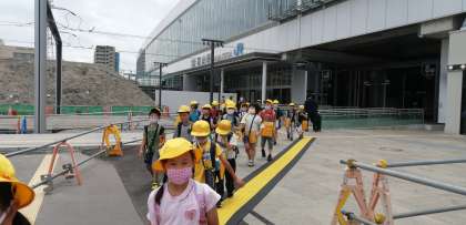 駅を出て、環水公園へ向かいます。たくさん歩いて疲れた子供たちは、お弁当を楽しみにしています。