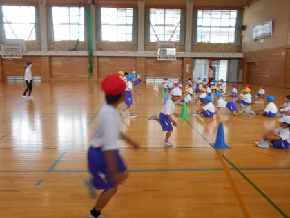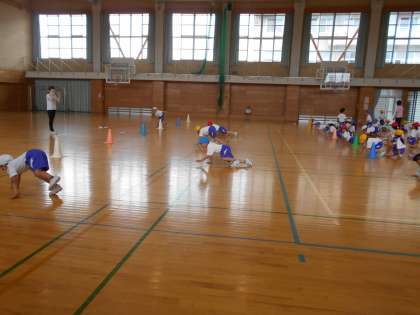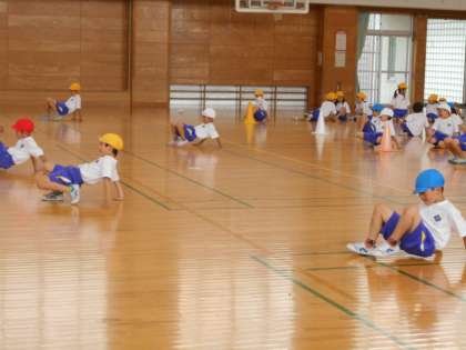 スキップやクマ歩き、クモ歩き等体をほぐす運動をがんばりました。
