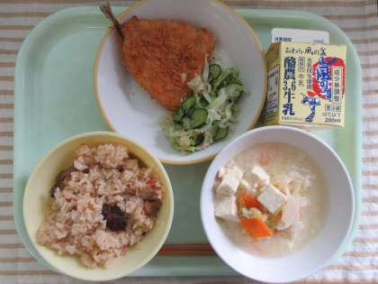 今日の献立は、五目ごはん、あじフライ、きざみ和え、打ち豆汁、牛乳です。