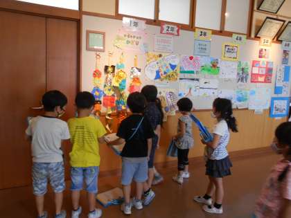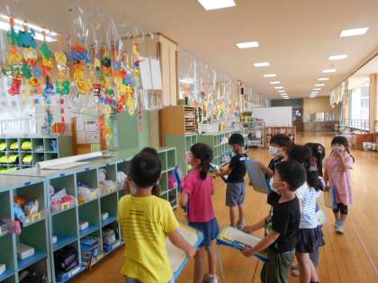 チョキチョキかざりのふりかえりと友達のすてきな作品を見つける活動をしました。