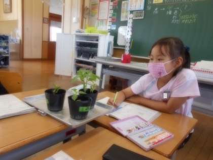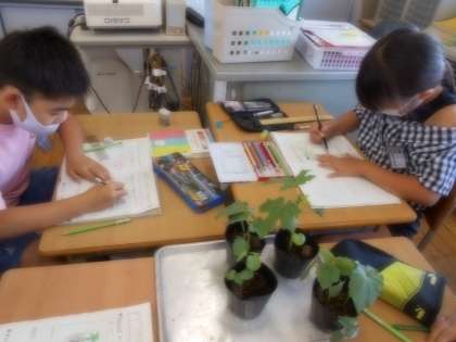 春に蒔いた種が、芽を出し大きく生長しています。今日は、大きくなった苗を観察しました。「高さは何センチメートルかな?」「葉は何枚あるかな?」