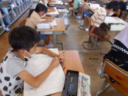 校外学習で実際に見てきたことをもとに、学習を進めています。今日は、見てきた様子を白地図に書き込みました。