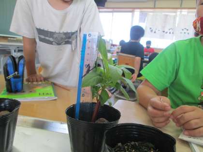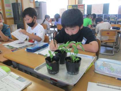 5月にまいた種が大きくなってきました。大きくなって背が伸びたり、葉の形が変わってきていたので、再度観察しました。子葉が出ているときと比較しながら観察している子供たちです。
